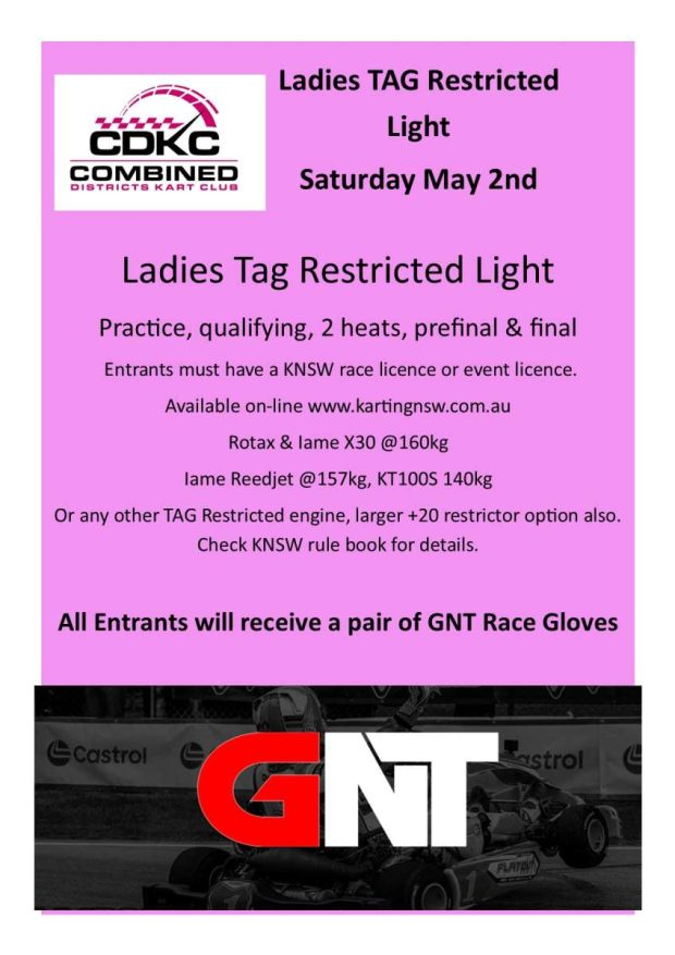 This is a great chance for Mums, Daughters, Sisters, Aunties and all Lady racers to have a great day at the track. TAG restricted light offers many engine options and our rules also allow a larger restrictor size for those that have a heavy kart to be competitive all in the one class.